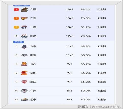 ①、豪取6连胜的广厦男篮以15胜2负继续领跑积分榜;